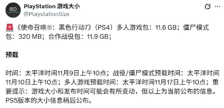 游戏资讯账号PlayStationSize通过设计平台披露了动视Treyarch即将推出的第一人称射击游戏《使命召唤:黑色行动7》预载日期与下载容量。