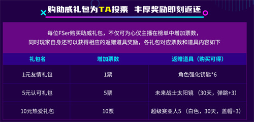 为鼓励粉丝积极支持心仪主播,活动推出了极具吸引力的助威礼包机制。据活动规则介绍,每位 FSer(粉丝)购买助威礼包后,不仅能为喜爱的主播在榜单中增加相应票数,助力主播冲击更高排名,自身还可获得对应的返赠道具奖励。不同助威礼包对应不同的增加票数和返赠道具内容,粉丝可根据自身需求和支持力度灵活选择。更值得关注的是,活动还设置了票数兑换代金券的福利环节,粉丝积累的票数可兑换实用代金券,进一步提升了参与活动的性价比,实现了“支持主播“与“自身获益”的双赢。