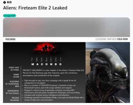 2025-11-132021年Cold Iron推出了合作第三人称射击游戏《异形:火力小队》,2024年7月Reddit网友泄露了续作《异形:火力小队2》的官方PPT文件,证实了续作的存在。当时的官方文件提到目标是在2025年发售,但几个小时前,《异形:火力