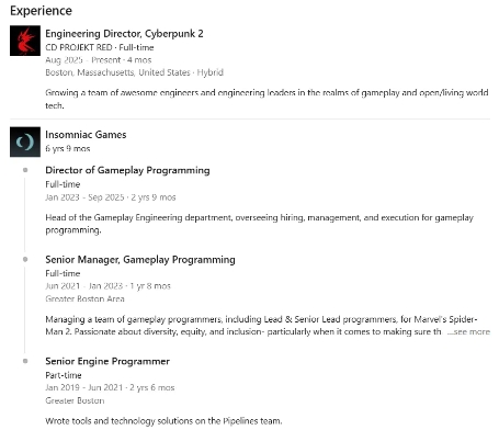根据领英上的信息,Jess将领导一支工程师团队,在CD Projekt Red波士顿分部开发《赛博朋克2》。这位总监此前曾在Insomniac Games工作近7年,参与开发了多个系列经典游戏。