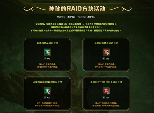 还有“神秘的RAID方块活动”,英雄们在活动期间完成指定战役,可获得“神秘的RAID方块碎片”,碎片可以在兑换商店兑换多种“方块”,不同的方块放入对应的材料道具,会复制并返还不同数量的奖励道具。