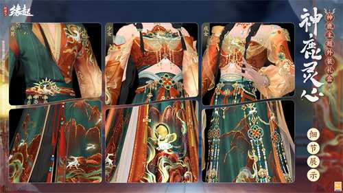 成女款绘以赤金云纹,层层裙摆内衬莹白轻纱,轻柔曼妙。裙身层叠铺展,裙摆绘就壁画般山石云纹与神鹿图样,色泽浓郁。珠串与玲珑玉饰垂于身侧,步态轻盈。