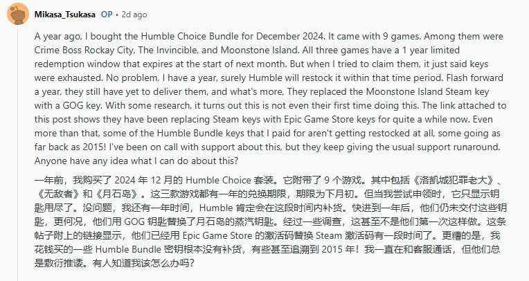 值得注意的是,此类情况并非孤例。用户AlexanderTheGrey创建的GitHub项目“Humble Bundle密钥兑换问题追踪列表”已记录了六起Steam密钥被替换为Epic激活码的确认案例,其中包括《死亡搁浅导演剪辑版》,且另有超过一百款来自Humble Choice捆绑包的游戏显示Steam密钥已耗尽,导致购买者无法兑换已付费产品。