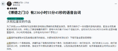 根据整理结果,《博德之门3》包含约173,642个语音文件,累计时长约236小时55分45秒,相当于连续近十天的语音内容。这些语音分布在约2068名角色 身上,显示出本作在声音制作层面的巨大规模。