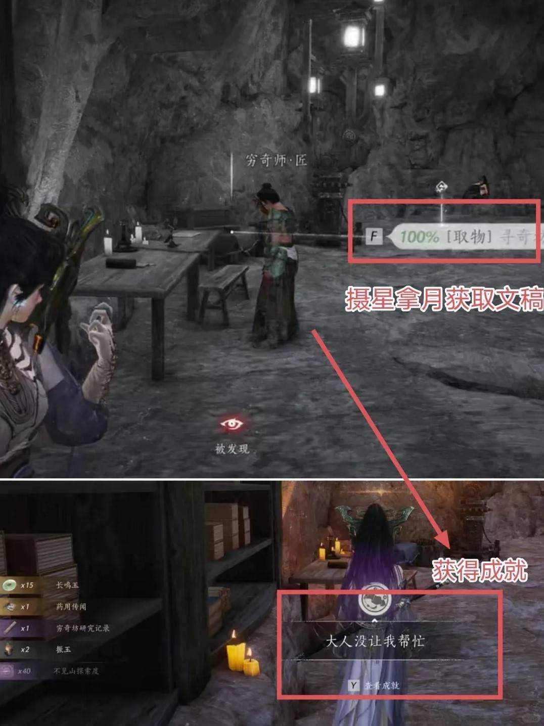 按照任务指引完成操作后,成功攻占据点,最终通过摄星拿月的方式获取了文稿,还解锁了【大人没让我帮忙】这一成就。