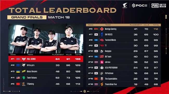 北斗所指,竞逐巅峰!11月28日 -12月14日,PUBG全球总决赛2025(以下简称PGC 2025)在泰国曼谷暹罗百丽宫已完美拉下帷幕,来自世界各地的33支劲旅经过3周的激烈争夺,最终来自泰国的FULL SENSE战队(FS)以155的总积分,拿下了本次PGC2025的总冠军,独享50万美元的奖金。同时,FULL SENSE战队的Belmoth选手还拿到了比赛的MVP。PGC2025亚军和季军则分别由Virtuspro和Natus Vincere斩获,奖金为15万美元跟12万美元。本次出征PGC2025的PCL赛区战队共有6支:A组的4AM、17、JDG,B组的PeRo、CTG、GSW,最终17战队以113的总积分位列总榜第5。
