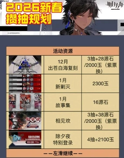 12月:苍白海复刻活动,完成后可获得3次抽卡机会及28源石,兑换紫票还可获得更多奖励。