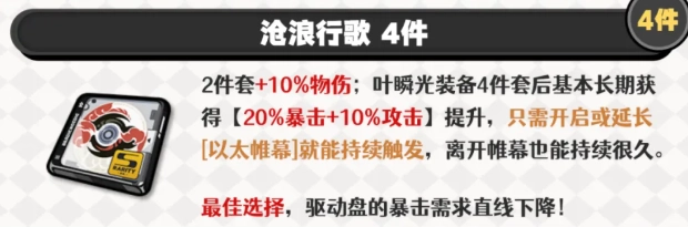 2、4件:装备者处于任意[以太帷幕]中时,自身暴击率提高10%,离开[以太帷幕]后,该增益效果仍然保留,持续15秒;装备者为[强攻]角色时,开启[以太帷幕]或延长[以太帷幕]的持续时间会使自身暴击率提升10%和攻击力提升10%,持续30秒,重复触发时刷新持续时间。