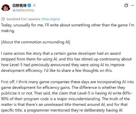 日野晃博在社交平台阐述了他的看法:“它(生成式AI)可能会将我们从开发AAA游戏需要5-10年的世界,转变为我们每两年就能享受到它们的世界。” 他认为,将AI视为“邪恶”之物可能有害于技术发展,业界应将其视为推动进步的工具。他还透露,许多开发者已在实践中使用生成式AI来提升效率,只是大多未公开其应用。