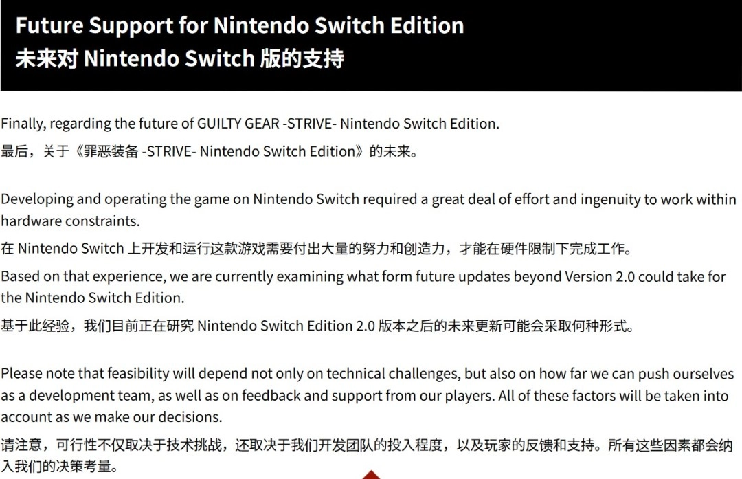 公告里,开发团队没明确说会马上停止支持,不过也承认,随着游戏后续更新内容越来越多、越来越复杂,Switch版本的持续运营将会越来越难。官方称:“关于《罪恶装备:STRIVE》Nintendo Switch版的后续发展,我们正在探讨2.0版本之后可能采用的更新方式。在Switch平台开发和运营游戏,需要我们在硬件条件的限制下投入很多精力,还要充分发挥创意。基于这样的经验,我们正在仔细评估后续更新是否可行。”