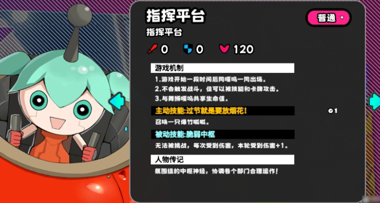 嘎呜也具有反击能力,且它每次在战斗中命中敌人后,会为自身叠加2点攻击,可无上限的进行叠加,而指挥平台则不会攻击玩家,同时也无法被玩家攻击,但会吃到来自手牌、技能的伤害,而且它每次受到伤害后,本轮内它接下里的每次受伤都将附带上伤害加1的效果。