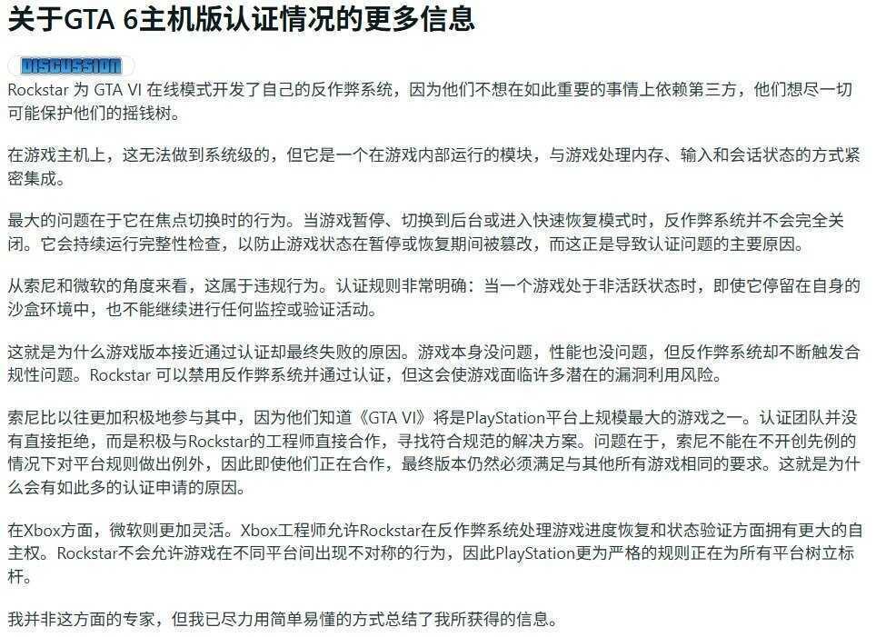 在这之后,另一位游戏行业相关人士披露了《GTA 6》认证失败的具体原因。据称问题源于Rockstar专门为下一代《GTA》在线模式研发的新型反作弊系统。这位相关人士称,R星为《GTA6》在线模式打造专属反作弊系统,是因为不愿在如此关键的问题上受制于第三方。而这个反作弊模块当游戏暂停、转入后台或快速恢复时,并未完全关闭。它一直在执行完整性检查,以防游戏状态在暂停/恢复期间被篡改,这正是触发多数认证问题的原因。