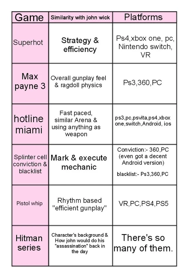 一年多前,Reddit《疾速追杀》游戏版块的玩家列出了一份目前可以玩到的《疾速追杀》风格游戏清单,最终选定了《马克思佩恩3》、《师父》、《杀手》三部曲、吴宇森的《枪神(Strangehold)》和《热血无赖》等游戏,认为这些游戏最能让人重温电影体验。