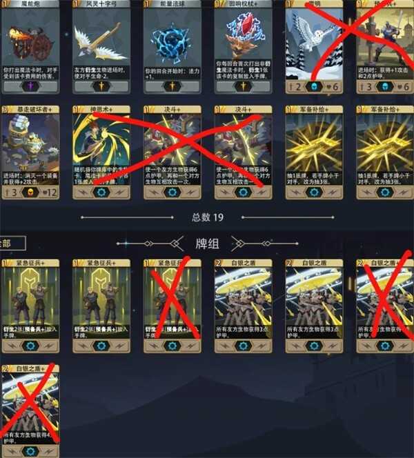 四、key卡:紧急征兵,需要固定,最好能保证每个回合手牌都有一张紧急征兵。——魔法:『白银之盾』、『军备补给』,见图片2,主要为了过牌——装备:荣耀权杖,天使翼(穿透直伤)等等,主要为了直伤。其中装备里面的突击长戟比较特殊,你有天使之翼的前提下才考虑拿,没有天使翼就不要拿。装备多的配合魔法卡升级后神恩术拉到手牌。