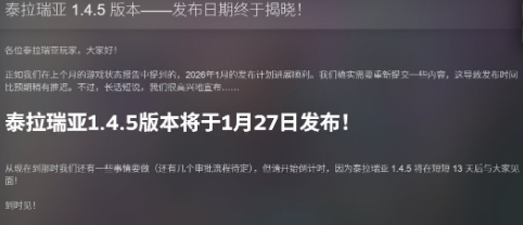 《泰拉瑞亚》开发者公布1.4.5版本更新确切发布日期。该更新将于2026年1月27日上线。