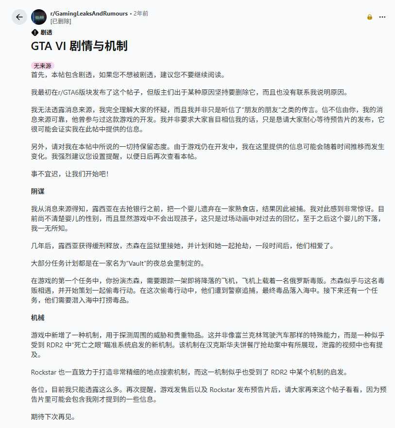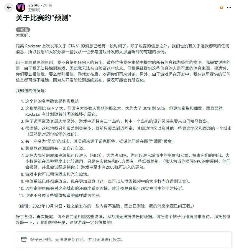R星或许在不经意间印证了《GTA6》的一则关键剧情爆料。此前R星曾称,因一名开发者泄露机密信息,他们已于2023年11月将该员工解雇。而相关消息早在2023年10月就已流出,爆料人LegacyKilla也证实了其真实性。