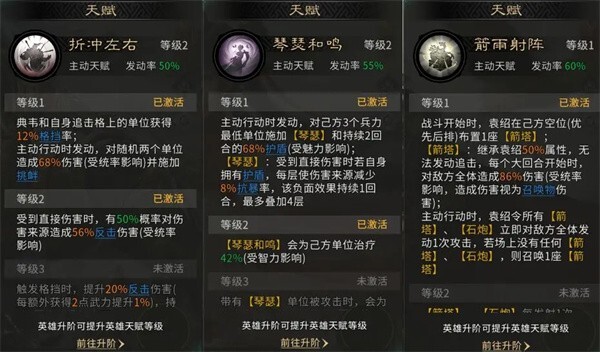 典韦的天赋【折冲左右】为追击格上单位提供格挡并随机挑衅两名敌方单位,为穿杨军提供良好的生存环境。小乔的天赋【琴瑟和鸣】对我方兵力最低的三个单位施加护盾与琴瑟(受到直接伤害时若自身拥有护盾,每层使伤害来源减少8%抗暴率),有效提高我方的生存能力。袁绍的天赋【箭雨射阵】在后排空位建造箭塔,使我方第三行藤甲兵被敌方击败后,袁绍召唤的箭塔位于第三行,为队伍分担伤害。