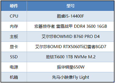 结合《如龙0:导演剪辑版》的配置要求,我们准备了一套能够畅玩该作的游戏配置。从硬件的选择和搭配上看,这套配置不仅使用的是酷睿i5-14400F处理器、B760主板以及RTX5060Ti显卡,内存和固态分别是16GB的DDR4 0套装以及1TB的PCIe 4.0硬盘,综合性能完全可以流畅玩转《如龙0:导演剪辑版》以及其它热门单机和网游,而且艾尔莎的板卡产品在做工、性能、稳定性等各方面都有着优秀的表现,长时间使用大可放心。