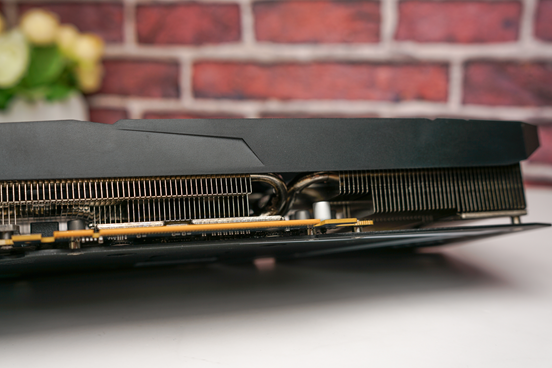 透过显卡的侧面这里,我们可以看到艾尔莎BOMID RTX5060Ti幻雷者8GD7的散热器有着相当密集的散热鳍片,同时里面还穿了5根镀镍热管,加上5+2相的核心供电以及8层PCB,整体做工用料可谓相当扎实。