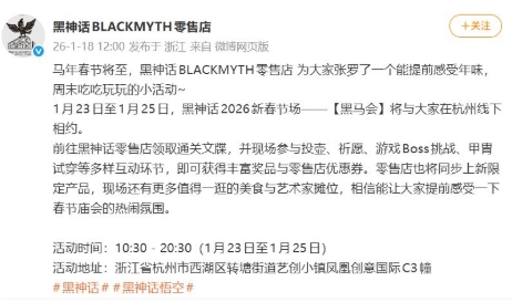近日,国产热门游戏IP《黑神话》官方零售店微博官宣了2026年首场线下活动“黑马会”,为粉丝们张罗了一个能提前感受年味,周末吃吃玩玩的小活动。