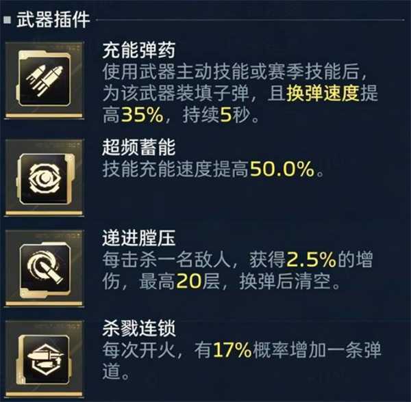 插件选择三槽递进压膛,可在击杀怪物时叠加+2.5% 增伤,最高可达50%增伤。