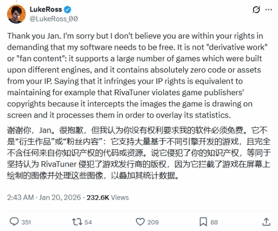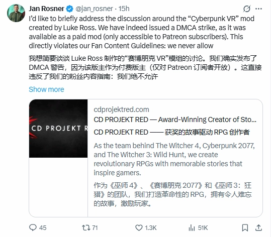 同时,CDPR副总监Jan Rosner也通过其个人X账号发布了这一消息——