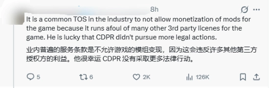 在CDPR的官方网站中,关于社区内容的条例中明确提到禁止为商业目的使用游戏,即不能强制收费,但粉丝自愿的捐款不涵盖在其中。很显然,LukeRoss强制他人付费的VR mod违反了这一规定。