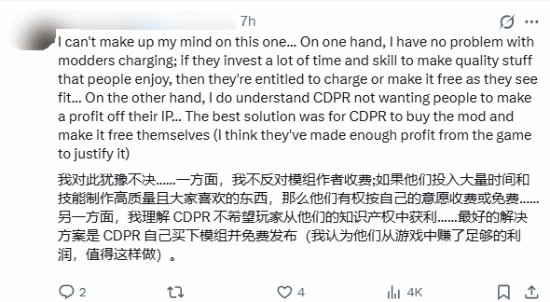大部分玩家都官方表示支持,认为mod作者此举侵犯了属于CDPR的著作权,底线不应当被逾越。