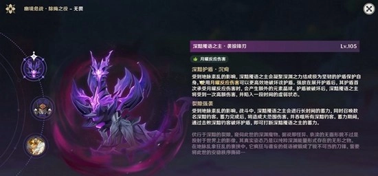 一、【月曜狗】开场生成一个血量占比45%的护盾,承受的月曜反应伤害提升至原伤害的300%;首次受到月曜伤害时,将生成蕴含36点能量的元素晶球。在蓄力释放终结技的过程中,会召唤出四个小怪,每个小怪拥有相当于本体18%的生命值;每击败一个小怪,护盾的生命值就会减少25%。当护盾被破除后,本体将损失20%的生命值并进入虚弱状态,虚弱期间全元素抗性降低60%。
