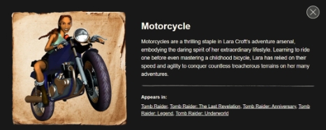 官方网站列出了劳拉身份的五大关键元素:双持手枪、弓箭、2013年重启作中首次出现的翡翠吊坠、克劳馥庄园,以及摩托车,后者被描述为“劳拉冒险装备中令人兴奋的一部分,体现了她非凡生活方式的精神”。