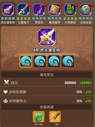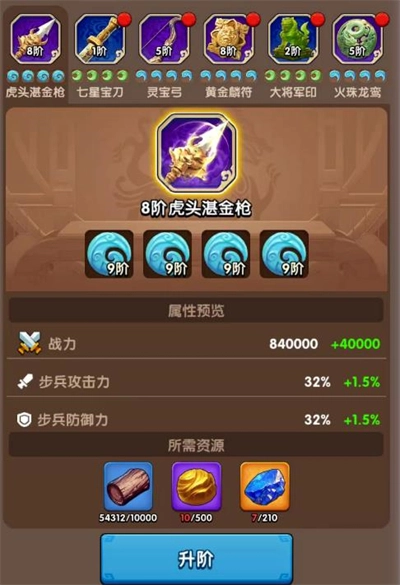 1、游戏里的神兵系统会在角色达到23级时解锁,玉石系统则要等到25级才开启。这两个系统是提升兵种(步兵、弓兵、骑兵)属性的核心关键。神兵分为左(对应步兵)、中(对应骑兵)、右(对应弓兵)三组,每组各有上下两个槽位,只有放入同兵种且等级相近的神兵,才能让加成效果达到最大。初始状态下能提供5%的攻防加成,升到满级后叠加起来最高可达160%!每个神兵可以镶嵌4颗玉石,玉石主要增加生命值和破坏力。当凑齐8颗玉石搭配2个神兵的满配置时,属性加成能达到320%,效果比橙色装备还要厉害!建议同兵种的神兵和玉石尽量同步升级,避免因偏重某一方而导致属性受损!