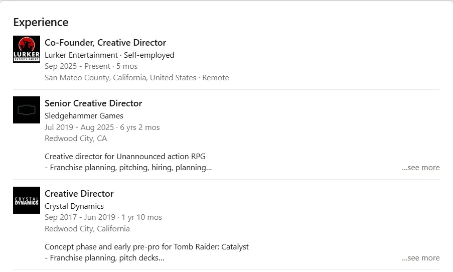 这一消息来自于Ben Wanat的领英个人资料。Ben Wanat曾是Sledgehammer Games的一位资深创意总监,负责这款未公布的动作RPG的创作。他参与了系列规划、游戏提案和人员招聘等工作。