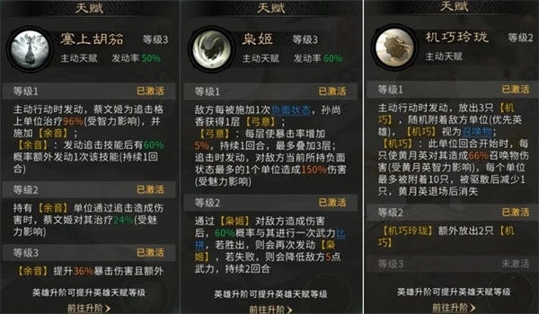 黄月英的主动技能默认带有【通权变达】,该技能会对随机三位敌方角色施加18%的攻击降低效果,同时有一定概率使其进入【技穷】状态。这一效果不仅可以对敌方形成限制,还能帮助孙尚香持续积累【弓意】层数,从而直接提升她的伤害输出。至于其他技能的搭配,则没有固定的模式,需要结合玩家在“多队共存”方面的阵容布局,以及当前所拥有的“技能练度”资源实际情况来做出选择。
