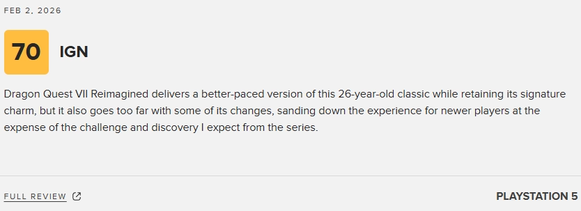 《勇者斗恶龙7:重制版》定档2月6日发售,其媒体评分也于近日揭晓。目前M站收录了49家媒体的评分,本作平均分为83分,IGN则给出了7分的评价。以下为部"/> 2026-02-04